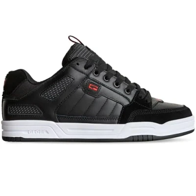 * The Globe Tilt skate shoe is one of Globe's best-selling shoe models and we can see why. Excellent value for money and style to boot! * Rodney Mullen signature colourway * Black action leather upper with black suede overlays on high-abrasion points and breathable mesh on the mid panel, all combined with subtle red details and a white and black sole unit * The Tilt has a durable cup sole and detailed upper constructed with unique panelled detail * Reflective 3M mesh * SHOCKBED pu insole * Triple stitched toe cap * The collar has extra padding for comfort and support * Upper construction made from action leather, suede and mesh * S-TRAC for ultimate Grip and Flex
