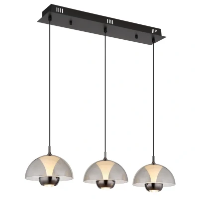 Discover the ARUS, a stylish pendant lamp that stands out for its harmonious design architecture. The ARUS consists of a straight rail that has three round umbrellas mounted on long hangers. The shades are equipped with spotlights on the inside, which creates a warm, diffused light. The length of the lamp makes it possible to place it even in long rooms or corridors. The body of the lamp is made of matt black metal, which gives it a modern and elegant look. The shades themselves are made of plastic and have a smoke-colored finish, while the inner edges are made of white, matte metal. The aluminium spotlight inside lights up and provides another lighting effect. With an output of 1400 lumens and a color temperature of 3000K, the ARUS is a perfect choice for anyone looking for modern and effective lighting for their living room or office. Product features: Pendant lamp metal black matt, plastic smoke colored, metal white matt, aluminium black glossy, cable pvc black, lxwxh: