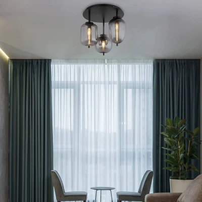 Lights.coBlacky ceiling light with different glass shades - 3-bulb This great ceiling light from the Blacky series impresses with its beautiful design. Three smoky-coloured, transparent glass shades of different shapes and sizes extend into the room from the round, black metal canopy. The bulbs remain visible, which is why we recommend using retrofit filament bulbs in the E14 sockets - externally dimmable