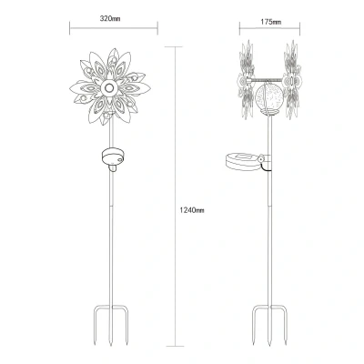 LED solar light 36578S in flower design with ground spike This solar light with ground spike in a filigree flower design consists of two metal flowers with a silver finish at the front and a black finish at the back, decorated with yellow glass stones. Between the two flowers is a clear glass sphere with a warm white LED - with switch on the solar module