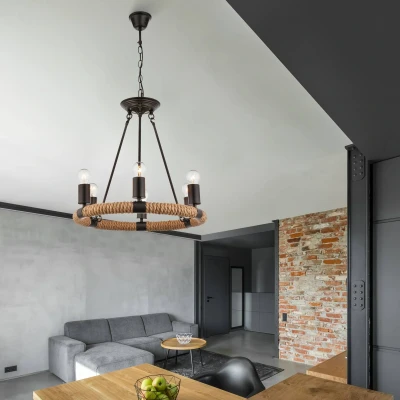 Rustic LED hanging light Ulleu in black design Traditional mood is invoked when the LED pendant light Ulleu shines in the room. Its rustic and robust design is characterized by a black, elaborately worked metal suspension system which ends in a wreath made of brown hemp rope. Six uniform black sockets are placed on this wreath which can be equipped with various light bulbs in the E27 socket, according to your wishes. The result is a cosy ambience which gives you a warm ambience in the evening. In the private dining area, but also in rustic restaurants or bars, the LED hanging light Ulleu fits in anywhere and creates a cosy ambience.