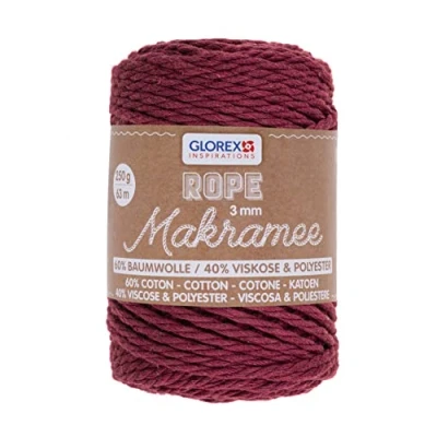 GLOREX 5 1007 08 Macrame Rope, 250 g, 3 mm, Length 63 m, Bordeaux, Triple Twisted Cotton Yarn, 60% Cotton, 40% Viscose and Polyester, for Crocheting, Knitting, Knitting Designing