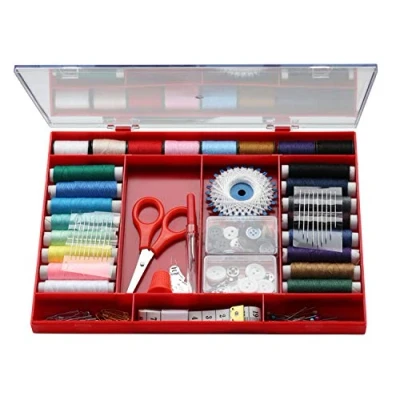 196-piece sewing assortment In a practical, clear plastic case Includes sewing thread, scissors, measuring tape, threader, thimble, embroidery needle, twine, buttons, press studs, head pins, safety pins, bra fasteners and hook fasteners Box Size: Approx. 23 x 23 x 2.5 cm A must-have for any household, ideal for small sewing jobs