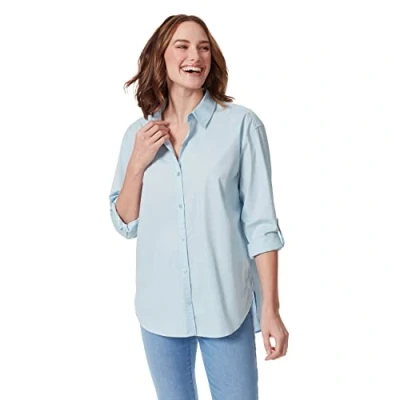 STYLE - Classy feminine cut button down shirt with tab roll up long sleeve, point collar and side slits on curved high low hem on an oversized loose fit body. VERSATILITY - Shirt goes with everything from slacks to jeans and leggings to skirts and shorts for flexability you want in a wardrob year round. Great look whether tucked in or not. LENGTH - This must have shirt has a 29 inch front / 30.5 inch back from shoulder to hem with 15.25 inches rolled up / 21.25 inches unrolled long sleeves. Gloria Vanderbilt - Effortlessly fun and stylish, versatile yet classic look that attracts and connects with the modern sensibility of consumers of all ages