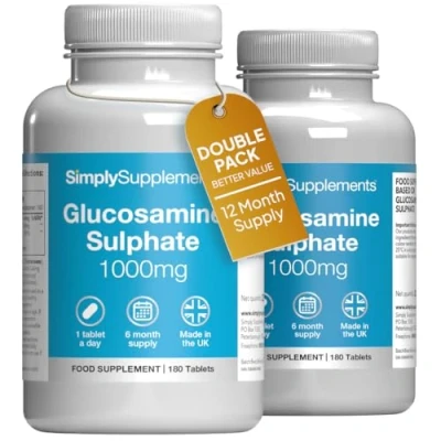 HIGH-STRENGTH 1000MG GLUCOSAMINE SULPHATE 2KCL: Each tablet contains a potent 1000mg dose of glucosamine sulphate 2KCl, providing a powerful daily supplement to support an active lifestyle. CONVENIENT ONE-A-DAY TABLETS: Just one fast-release, coated tablet per day provides your full daily dose. With 360 tablets (2 x 180), you get a full 12-month supply in a convenient two-bottle pack. SUSTAINABLY MARINE-SOURCED INGREDIENTS: Our glucosamine is derived from premium marine sources, ensuring purity, consistency, and quality in every tablet. MANUFACTURED TO GMP STANDARDS: Produced in UK facilities under strict GMP regulations and third-party tested to guarantee safety, reliability, and high quality. TRUSTED EXPERTISE FOR DAILY SUPPORT: Backed by over 20 years of experience in supplements, Simply Supplements delivers premium, science-informed formulations for your daily routine.