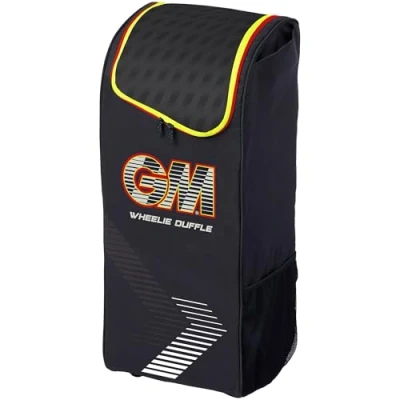 GM Rival Wheelie Duffle Cricket Bag Holdall Sleeve for 1 Bat Adjustable Comfort Straps Shoe Tunnel Volume 55 litres Tough 600 Denier Polyester Black Red & Yellow Gunn Moore