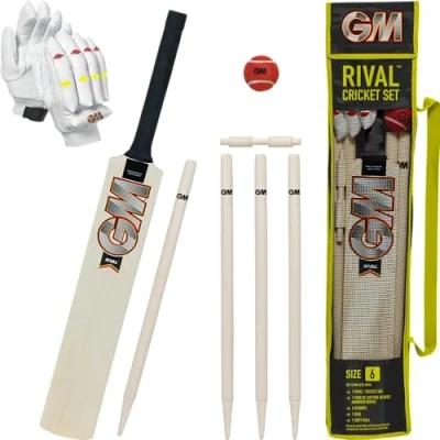 The Size 6 Rival Wooden Cricket bat is ideal for all junior cricket players who are between 157 to 163 cm tall – other sizes are available Ball – The red cricket ball is similar to a tennis ball in weight and construction, perfect for the beginner player to maximise their enjoyment of the game Stumps and Bails - The wooden bail is a solid 1-piece bail - 4 Wooden Stumps included. Use 1 as a spare, or a marker for the bowling crease Ambidextrous batting gloves included, easy to locate and store in the durable carry bag The GM ‘Young Gunn’ cricket range has been specially designed to give future international cricketers a flying start to their careers - approved and endorsed by Team GM