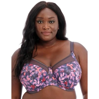 Three section cup plus side panel for forward shape and lift Sheer top cup with V-neck plunge shape for a lighter look and flattering neckline Silky soft simplex cups give great shape Two or three rows of hook and eyes dependent on size Printed overlay on neck edge and straps
