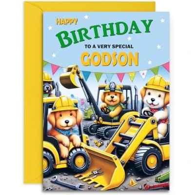 Godson Kids Birthday Card Doggy Digger Crane Design for Boy A5 Size with Yellow Envelope