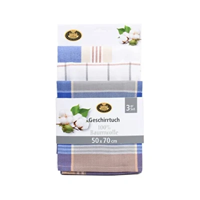High-quality tea towels (50 x 70 cm) for drying glasses and dishes, wiping surfaces etc. Classic, decorative designs, suitable for any kitchen: Plain check pattern (2 items) and stripes (1 item), Practical 3-pack Durable, hard-wearing and particularly absorbent due to high material density (260 g/m²), Quick drying Easy care: Washable at 60°C, Dryer-resistant Contents: 1x Gözze Three-piece Tea Towel Set, Dimensions: 50 x 70 cm, Colour: Aqua, Material: 100% Cotton, 60058-55-5070