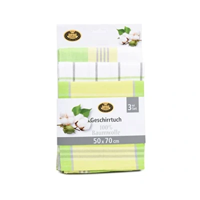 High-quality tea towels (50 x 70 cm) for drying glasses and dishes, wiping surfaces etc. Classic, decorative designs, suitable for any kitchen: Plain check pattern (2 items) and stripes (1 item), Practical 3-pack Durable, hard-wearing and particularly absorbent due to high material density (260 g/m²), Quick drying Easy care: Washable at 60°C, Dryer-resistant Contents: 1x Gözze Three-piece Tea Towel Set, Dimensions: 50 x 70 cm, Colour: Green, Material: 100% Cotton, 60058-80-5070
