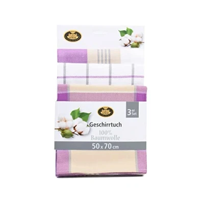 High-quality tea towels (50 x 70 cm) for drying glasses and dishes, wiping surfaces etc. Classic, decorative designs, suitable for any kitchen: Plain check pattern (2 items) and stripes (1 item), Practical 3-pack Durable, hard-wearing and particularly absorbent due to high material density (260 g/m²), Quick drying Easy care: Washable at 60°C, Dryer-resistant Contents: 1x Gözze Three-piece Tea Towel Set, Dimensions: 50 x 70 cm, Colour: Purplec, Material: 100% Cotton, 60058-35-5070