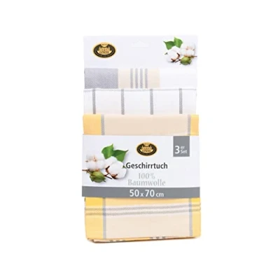 High-quality tea towels (50 x 70 cm) for drying glasses and dishes, wiping surfaces etc. Classic, decorative designs, suitable for any kitchen: Plain check pattern (2 items) and stripes (1 item), Practical 3-pack Durable, hard-wearing and particularly absorbent due to high material density (260 g/m²), Quick drying Easy care: Washable at 60°C, Dryer-resistant Contents: 1x Gözze Three-piece Tea Towel Set, Dimensions: 50 x 70 cm, Colour: Yellow, Material: 100% Cotton, 60058-11-5070