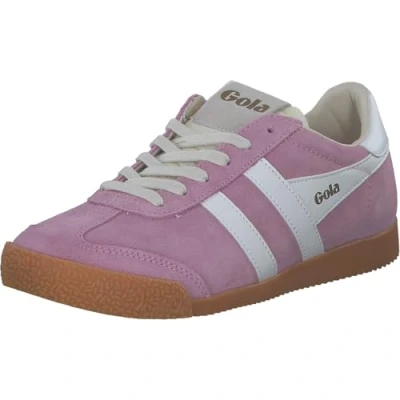 Heritage inspired Gola trainers with premium suede upper for timeless look. Durable gum outsole for classic style and reliable traction. Brand: Gola, available in UK sizes 3 to 8, pink color, women's department. Suede upper, sneaker style, made in China, lace-up closure, no customization. Suitable for spring/summer, offers comfort, rubber outsole, logo accents.