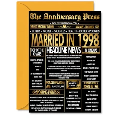 MAKE THEM SMILE WITH THIS UNIQUE GOLD ANNIVERSARY CARD: This exceptional quality anniversary card for her or him shows the design 'The Anniversary Press Married In 1998'. If you are looking for special anniversary greetings cards for Women wedding anniversary card then then this happy anniversary card is bound to make them smile. Not just for anniversary gifts for Men this could also be for Partner, Wife, Companion or Husband. WHAT DO YOU GET: The cards are printed on both sides with the inside print saying 'Read All About It! Have A Headline Grabbing Newsworthy Anniversary' and ample space for your own personal message. The unique gold design is printed on a specially sourced and environmentally responsible board. At 360 microns thick the natural white one-sided gloss board has a quality look and feel. Supplied with a coloured gummed envelope to complement the design and ready to be sealed and sent in the post. NO INK SMUDGES: There is nothing worse than writing inside a card to find that the shiny surface makes the ink smudge. This is why we use a high quality one sided coated board. The uncoated side will absorb more of the ink from your pen to make smudging a thing of the past. 28th anniversary card for Companion, 28th anniversary card for Husband, 28th anniversary card for Partner. SIZES: Greeting Card = 148mm x 210mm, Envelope = 150mm x 212mm, Card Thickness = 360 micron. Partner 28th anniversary card, anniversary cards for Wife, cute anniversary cards for Companion, 28th anniversary card Husband, Partner 28th anniversary card. MADE AND QUALITY CHECKED IN THE UK: We print and manufacture all our products right here in the UK so you can be sure of a fast turnaround and a product that is expertly made. Using environmentally responsible premium board our card is conscious of the responsible management of the world's forests - perfect anniversary cards for Men, cute anniversary cards for her, Wife 28th anniversary cards, female anniversary cards.