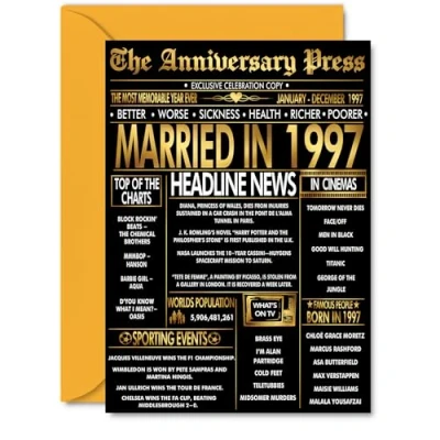 MAKE THEM SMILE WITH THIS UNIQUE GOLD ANNIVERSARY CARD: This exceptional quality anniversary card for her or him shows the design 'The Anniversary Press Married In 1997'. If you are looking for special anniversary greetings cards for Women wedding anniversary card then then this happy anniversary card is bound to make them smile. Not just for anniversary gifts for Men this could also be for Husband, Partner, Wife or Companion. WHAT DO YOU GET: The cards are printed on both sides with the inside print saying 'Read All About It! Have A Headline Grabbing Newsworthy Anniversary' and ample space for your own personal message. The unique gold design is printed on a specially sourced and environmentally responsible board. At 360 microns thick the natural white one-sided gloss board has a quality look and feel. Supplied with a coloured gummed envelope to complement the design and ready to be sealed and sent in the post. NO INK SMUDGES: There is nothing worse than writing inside a card to find that the shiny surface makes the ink smudge. This is why we use a high quality one sided coated board. The uncoated side will absorb more of the ink from your pen to make smudging a thing of the past. 29th anniversary card for Wife, 29th anniversary card for Companion, 29th anniversary card for Husband. SIZES: Greeting Card = 148mm x 210mm, Envelope = 150mm x 212mm, Card Thickness = 360 micron. Husband 29th anniversary card, anniversary cards for Partner, cute anniversary cards for Wife, 29th anniversary card Companion, Husband 29th anniversary card. MADE AND QUALITY CHECKED IN THE UK: We print and manufacture all our products right here in the UK so you can be sure of a fast turnaround and a product that is expertly made. Using environmentally responsible premium board our card is conscious of the responsible management of the world's forests - perfect anniversary cards for Men, cute anniversary cards for her, Partner 29th anniversary cards, female anniversary cards.