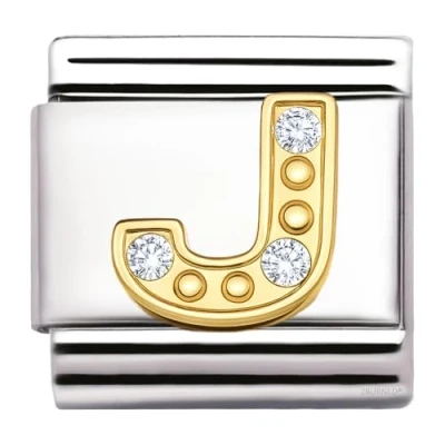 GOLD AZ Letter Italian Charm 9mm Golden Steel Bracelet Link with Cubic Zirconia Initial, Fits Modular Stretch Bracelets, Alphabet Jewellery Gift (J charm)
