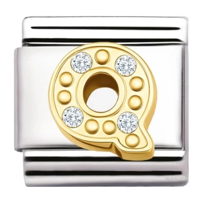 GOLD AZ Letter Italian Charm 9mm Golden Steel Bracelet Link with Cubic Zirconia Initial, Fits Modular Stretch Bracelets, Alphabet Jewellery Gift (Q charm)