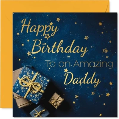 MAKE YOUR DADDY SMILE WITH THIS UNIQUE GOLD BIRTHDAY CARD: This exceptional quality Daddy birthday card shows the design 'Happy Birthday To An Amazing Daddy'. If you are looking for a beautiful birthday card for Daddy, then then this happy birthday Daddy card is bound to make them smile. Not just a birthday card for Daddy this could also be a birthday gifts for Daddy, Dad or Papa. WHAT DO YOU GET: The card is printed on one side and BLANK ON THE INSIDE to allow you to write your very own message. The unique gold design is printed on a specially sourced and environmentally responsible board. At 360 microns thick the natural white one-sided gloss board has a quality look and feel. Supplied with a coloured gummed envelope to complement the design and ready to be sealed and sent in the post. Great Daddy birthday cards, Son birthday card, Dad birthday card. NO INK SMUDGES: There is nothing worse than writing inside a card to find that the shiny surface makes the ink smudge. This is why we use a high quality one sided coated board. The uncoated side will absorb more of the ink from your pen to make smudging a thing of the past. Daddy birthday cards, Daddy birthday cards from Son. SIZES: Greeting Card = 145mm x 145mm, Envelope = 155mm x 155mm, Card Thickness = 360 micron. Happy birthday Daddy, Daddys birthday card, Daddy cards birthday, birthday card Daddy, happy birthday Daddy card, Daddy gifts from Son. MADE AND QUALITY CHECKED IN THE UK: We print and manufacture all our products right here in the UK so you can be sure of a fast turnaround and a product that is expertly made. Using environmentally responsible premium board our card is conscious of the responsible management of the world's forests - happy birthday card Daddy, Daddy birthday cards.