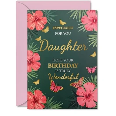 MAKE YOUR DAUGHTER SMILE WITH THIS UNIQUE GOLD BIRTHDAY CARD: This exceptional quality Daughter birthday card shows the design 'Especially for you Daughter hope your Birthday is truly wonderful'. If you are looking for a beautiful birthday card for Daughter, then then this happy birthday Daughter card is bound to make them smile. Not just a birthday card for Daughter this could also be a birthday gifts for Daughter, Step Daughter or Daughter in Law. WHAT DO YOU GET: The cards are printed on both sides with the inside print saying '0' and ample space for your own personal message. The unique gold design is printed on a specially sourced and environmentally responsible board. At 360 microns thick the natural white one-sided gloss board has a quality look and feel. Supplied with a coloured gummed envelope to complement the design and ready to be sealed and sent in the post. NO INK SMUDGES: There is nothing worse than writing inside a card to find that the shiny surface makes the ink smudge. This is why we use a high quality one sided coated board. The uncoated side will absorb more of the ink from your pen to make smudging a thing of the past. Daughter birthday cards, Daughter birthday cards from Dad. SIZES: Greeting Card = 148mm x 210mm, Envelope = 150mm x 212mm, Card Thickness = 360 micron. Happy birthday Daughter, Daughters birthday card, Daughter cards birthday, birthday card Daughter, happy birthday Daughter card, Daughter gifts from Dad. MADE AND QUALITY CHECKED IN THE UK: We print and manufacture all our products right here in the UK so you can be sure of a fast turnaround and a product that is expertly made. Using environmentally responsible premium board our card is conscious of the responsible management of the world's forests - happy birthday card Daughter, Daughter birthday cards.