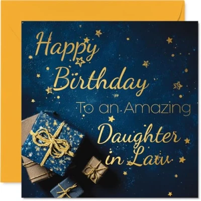 MAKE YOUR DAUGHTER IN LAW SMILE WITH THIS UNIQUE GOLD BIRTHDAY CARD: This exceptional quality Daughter in Law birthday card shows the design 'Happy Birthday To An Amazing Daughter in Law'. If you are looking for a beautiful birthday card for Daughter in Law, then then this happy birthday Daughter in Law card is bound to make them smile. Not just a birthday card for Daughter in Law this could also be a birthday gifts for Daughter in Law, Daughter or Step Daughter. WHAT DO YOU GET: The card is printed on one side and BLANK ON THE INSIDE to allow you to write your own message. The unique gold design is printed on a specially sourced and environmentally responsible board. At 360 microns thick the natural white one-sided gloss board has a quality look and feel. Supplied with a coloured gummed envelope to complement the design and ready to be sealed and sent in the post. Great Daughter in Law birthday cards, Father Dad birthday card, Daughter birthday card. NO INK SMUDGES: There is nothing worse than writing inside a card to find that the shiny surface makes the ink smudge. This is why we use a high quality one sided coated board. The uncoated side will absorb more of the ink from your pen to make smudging a thing of the past. Daughter in Law birthday cards, Daughter in Law birthday cards from Father Dad. SIZES: Greeting Card = 145mm x 145mm, Envelope = 155mm x 155mm, Card Thickness = 360 micron. Happy birthday Daughter in Law, Daughter in Laws birthday card, Daughter in Law cards birthday, birthday card Daughter in Law, happy birthday Daughter in Law card, Daughter in Law gifts from Father Dad. MADE AND QUALITY CHECKED IN THE UK: We print and manufacture all our products right here in the UK so you can be sure of a fast turnaround and a product that is expertly made. Using environmentally responsible premium board our card is conscious of the responsible management of the world's forests - happy birthday card Daughter in Law, Daughter in Law birthday cards.