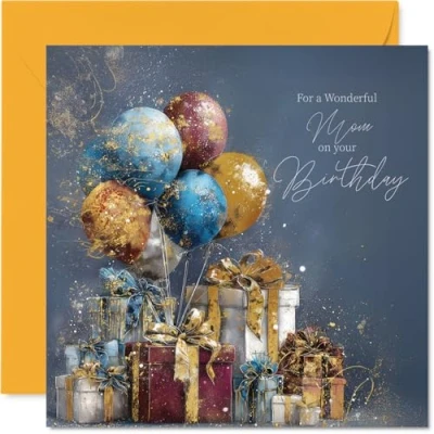 Gold Mom Birthday Card Balloons & Presents Happy for from Son Daughter, 145mm Golden Bday Greeting Cards