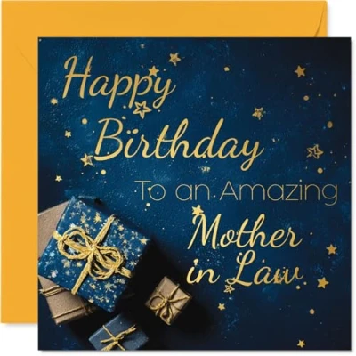 MAKE YOUR MOTHER IN LAW SMILE WITH THIS UNIQUE GOLD BIRTHDAY CARD: This exceptional quality Mother in Law birthday card shows the design 'Happy Birthday To An Amazing Mother in Law'. If you are looking for a beautiful birthday card for Mother in Law, then then this happy birthday Mother in Law card is bound to make them smile. Not just a birthday card for Mother in Law this could also be a birthday gifts for Mother in Law, Mum or Mom. WHAT DO YOU GET: The card is printed on one side and BLANK ON THE INSIDE to allow you to write your very own message. The unique gold design is printed on a specially sourced and environmentally responsible board. At 360 microns thick the natural white one-sided gloss board has a quality look and feel. Supplied with a coloured gummed envelope to complement the design and ready to be sealed and sent in the post. Great Mother in Law birthday cards, Son birthday card, Mum birthday card. NO INK SMUDGES: There is nothing worse than writing inside a card to find that the shiny surface makes the ink smudge. This is why we use a high quality one sided coated board. The uncoated side will absorb more of the ink from your pen to make smudging a thing of the past. Mother in Law birthday cards, Mother in Law birthday cards from Son. SIZES: Greeting Card = 145mm x 145mm, Envelope = 155mm x 155mm, Card Thickness = 360 micron. Happy birthday Mother in Law, Mother in Laws birthday card, Mother in Law cards birthday, birthday card Mother in Law, happy birthday Mother in Law card, Mother in Law gifts from Son. MADE AND QUALITY CHECKED IN THE UK: We print and manufacture all our products right here in the UK so you can be sure of a fast turnaround and a product that is expertly made. Using environmentally responsible premium board our card is conscious of the responsible management of the world's forests - happy birthday card Mother in Law, Mother in Law birthday cards.