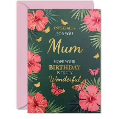 Gold Mum Birthday Card Butterflies & Flowers Happy for from Son Daughter, A5 Golden Bday Greeting Cards