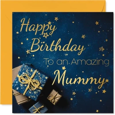 MAKE YOUR MUMMY SMILE WITH THIS UNIQUE GOLD BIRTHDAY CARD: This exceptional quality Mummy birthday card shows the design 'Happy Birthday To An Amazing Mummy'. If you are looking for a beautiful birthday card for Mummy, then then this happy birthday Mummy card is bound to make them smile. Not just a birthday card for Mummy this could also be a birthday gifts for Mummy, Mum or Mother. WHAT DO YOU GET: The card is printed on one side and BLANK ON THE INSIDE to allow you to write your very own message. The unique gold design is printed on a specially sourced and environmentally responsible board. At 360 microns thick the natural white one-sided gloss board has a quality look and feel. Supplied with a coloured gummed envelope to complement the design and ready to be sealed and sent in the post. Great Mummy birthday cards, Son birthday card, Mum birthday card. NO INK SMUDGES: There is nothing worse than writing inside a card to find that the shiny surface makes the ink smudge. This is why we use a high quality one sided coated board. The uncoated side will absorb more of the ink from your pen to make smudging a thing of the past. Mummy birthday cards, Mummy birthday cards from Son. SIZES: Greeting Card = 145mm x 145mm, Envelope = 155mm x 155mm, Card Thickness = 360 micron. Happy birthday Mummy, Mummys birthday card, Mummy cards birthday, birthday card Mummy, happy birthday Mummy card, Mummy gifts from Son. MADE AND QUALITY CHECKED IN THE UK: We print and manufacture all our products right here in the UK so you can be sure of a fast turnaround and a product that is expertly made. Using environmentally responsible premium board our card is conscious of the responsible management of the world's forests - happy birthday card Mummy, Mummy birthday cards.