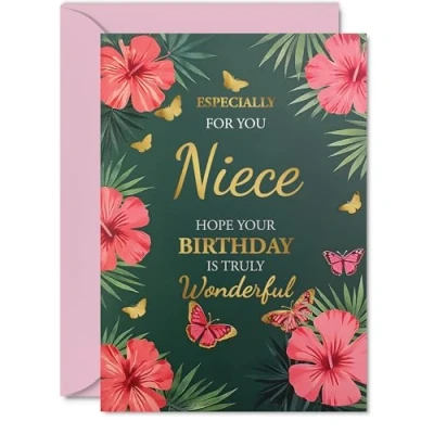 MAKE YOUR NIECE SMILE WITH THIS UNIQUE GOLD BIRTHDAY CARD: This exceptional quality Niece birthday card shows the design 'Especially for you Niece hope your Birthday is truly wonderful'. If you are looking for a beautiful birthday card for Niece, then then this happy birthday Niece card is bound to make them smile. Not just a birthday card for Niece this could also be a birthday gifts for Niece, Step Niece or Niece in Law. WHAT DO YOU GET: The cards are printed on both sides with the inside print saying '0' and ample space for your own personal message. The unique gold design is printed on a specially sourced and environmentally responsible board. At 360 microns thick the natural white one-sided gloss board has a quality look and feel. Supplied with a coloured gummed envelope to complement the design and ready to be sealed and sent in the post. NO INK SMUDGES: There is nothing worse than writing inside a card to find that the shiny surface makes the ink smudge. This is why we use a high quality one sided coated board. The uncoated side will absorb more of the ink from your pen to make smudging a thing of the past. Niece birthday cards, Niece birthday cards from Auntie. SIZES: Greeting Card = 148mm x 210mm, Envelope = 150mm x 212mm, Card Thickness = 360 micron. Happy birthday Niece, Nieces birthday card, Niece cards birthday, birthday card Niece, happy birthday Niece card, Niece gifts from Auntie. MADE AND QUALITY CHECKED IN THE UK: We print and manufacture all our products right here in the UK so you can be sure of a fast turnaround and a product that is expertly made. Using environmentally responsible premium board our card is conscious of the responsible management of the world's forests - happy birthday card Niece, Niece birthday cards.