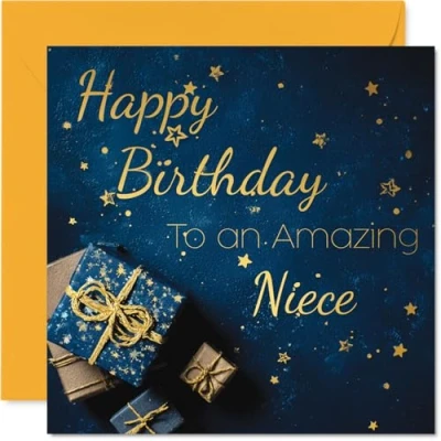 MAKE YOUR NIECE SMILE WITH THIS UNIQUE GOLD BIRTHDAY CARD: This exceptional quality Niece birthday card shows the design 'Happy Birthday To An Amazing Niece'. If you are looking for a beautiful birthday card for Niece, then then this happy birthday Niece card is bound to make them smile. Not just a birthday card for Niece this could also be a birthday gifts for Niece, Step Niece or Niece in Law. WHAT DO YOU GET: The card is printed on one side and BLANK ON THE INSIDE to allow you to write your very own message. The unique gold design is printed on a specially sourced and environmentally responsible board. At 360 microns thick the natural white one-sided gloss board has a quality look and feel. Supplied with a coloured gummed envelope to complement the design and ready to be sealed and sent in the post. Great Niece birthday cards, Auntie birthday card, Step Niece birthday card. NO INK SMUDGES: There is nothing worse than writing inside a card to find that the shiny surface makes the ink smudge. This is why we use a high quality one sided coated board. The uncoated side will absorb more of the ink from your pen to make smudging a thing of the past. Niece birthday cards, Niece birthday cards from Auntie. SIZES: Greeting Card = 145mm x 145mm, Envelope = 155mm x 155mm, Card Thickness = 360 micron. Happy birthday Niece, Nieces birthday card, Niece cards birthday, birthday card Niece, happy birthday Niece card, Niece gifts from Auntie. MADE AND QUALITY CHECKED IN THE UK: We print and manufacture all our products right here in the UK so you can be sure of a fast turnaround and a product that is expertly made. Using environmentally responsible premium board our card is conscious of the responsible management of the world's forests - happy birthday card Niece, Niece birthday cards.