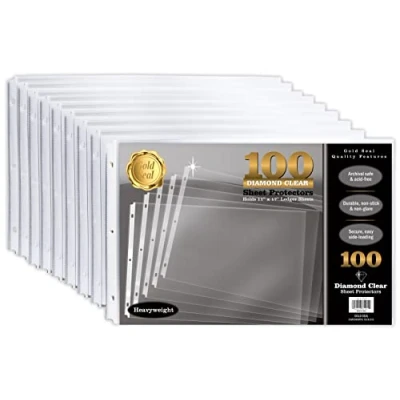 BULK PACK - 100 Heavyweight (0.08mm/3.2mil) flat ledger-sized sheet protectors with no crease DIAMOND CLEAR - Non-hazy, clear view sheets to present your documents in their true colors HEAVYWEIGHT - Thick 0.08mm/3.2mil polypropylene (PP) for utmost protection of your documents SIDE-LOADING - Load documents from the left front edge SUPERIOR QUALITY - Archival safe and acid-free, non-stick and non-glare
