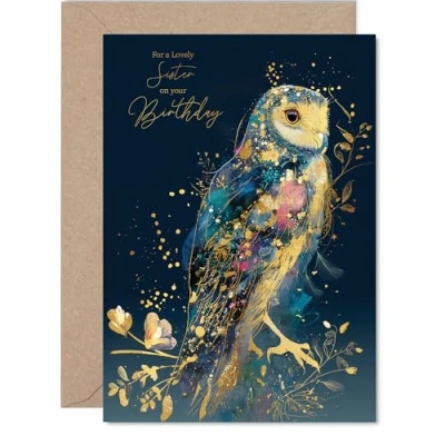 Gold Sister Birthday Card Luxury Wisdom Owl Happy for from Brother Sibling, A5 Golden Fantasy Nature Chic Bday Greeting Cards