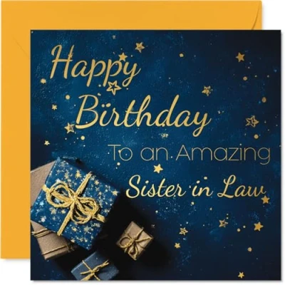 MAKE YOUR SISTER IN LAW SMILE WITH THIS UNIQUE GOLD BIRTHDAY CARD: This exceptional quality Sister in Law birthday card shows the design 'Happy Birthday To An Amazing Sister in Law'. If you are looking for a beautiful birthday card for Sister in Law, then then this happy birthday Sister in Law card is bound to make them smile. Not just a birthday card for Sister in Law this could also be a birthday gifts for Sister in Law, Sister or Silbing. WHAT DO YOU GET: The card is printed on one side and BLANK ON THE INSIDE to allow you to write your very own message. The unique gold design is printed on a specially sourced and environmentally responsible board. At 360 microns thick the natural white one-sided gloss board has a quality look and feel. Supplied with a coloured gummed envelope to complement the design and ready to be sealed and sent in the post. Great Sister in Law birthday cards, Brother birthday card, Sister birthday card. NO INK SMUDGES: There is nothing worse than writing inside a card to find that the shiny surface makes the ink smudge. This is why we use a high quality one sided coated board. The uncoated side will absorb more of the ink from your pen to make smudging a thing of the past. Sister in Law birthday cards, Sister in Law birthday cards from Brother. SIZES: Greeting Card = 145mm x 145mm, Envelope = 155mm x 155mm, Card Thickness = 360 micron. Happy birthday Sister in Law, Sister in Laws birthday card, Sister in Law cards birthday, birthday card Sister in Law, happy birthday Sister in Law card, Sister in Law gifts from Brother. MADE AND QUALITY CHECKED IN THE UK: We print and manufacture all our products right here in the UK so you can be sure of a fast turnaround and a product that is expertly made. Using environmentally responsible premium board our card is conscious of the responsible management of the world's forests - happy birthday card Sister in Law, Sister in Law birthday cards.