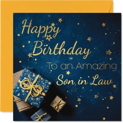 MAKE YOUR SON IN LAW SMILE WITH THIS UNIQUE GOLD BIRTHDAY CARD: This exceptional quality Son in Law birthday card shows the design 'Happy Birthday To An Amazing Son in Law'. If you are looking for a beautiful birthday card for Son in Law, then then this happy birthday Son in Law card is bound to make them smile. Not just a birthday card for Son in Law this could also be a birthday gifts for Son in Law, Step Son or Son in Law. WHAT DO YOU GET: The card is printed on one side and BLANK ON THE INSIDE to allow you to write your very own message. The unique gold design is printed on a specially sourced and environmentally responsible board. At 360 microns thick the natural white one-sided gloss board has a quality look and feel. Supplied with a coloured gummed envelope to complement the design and ready to be sealed and sent in the post. Great Son in Law birthday cards, Mother Mum birthday card, Step Son birthday card. NO INK SMUDGES: There is nothing worse than writing inside a card to find that the shiny surface makes the ink smudge. This is why we use a high quality one sided coated board. The uncoated side will absorb more of the ink from your pen to make smudging a thing of the past. Son in Law birthday cards, Son in Law birthday cards from Mother Mum. SIZES: Greeting Card = 145mm x 145mm, Envelope = 155mm x 155mm, Card Thickness = 360 micron. Happy birthday Son in Law, Son in Laws birthday card, Son in Law cards birthday, birthday card Son in Law, happy birthday Son in Law card, Son in Law gifts from Mother Mum. MADE AND QUALITY CHECKED IN THE UK: We print and manufacture all our products right here in the UK so you can be sure of a fast turnaround and a product that is expertly made. Using environmentally responsible premium board our card is conscious of the responsible management of the world's forests - happy birthday card Son in Law, Son in Law birthday cards.