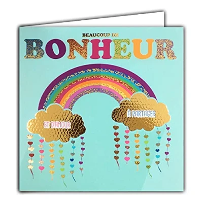 Gold Square Card Many Happiness and Love to Share Rainbow Clouds Hearts
