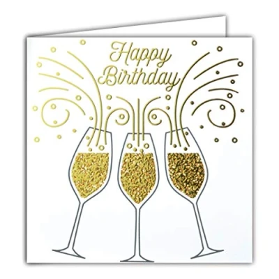Gold Square Happy Birthday Card Cups Champagne Flutes Wine Sparkling Bubbles Party