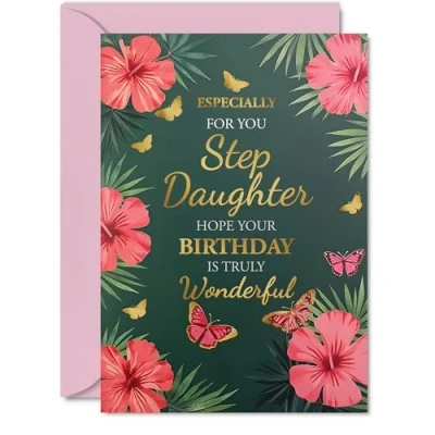 Gold Step Daughter Birthday Card Butterflies & Flowers Happy for from Dad Mum, A5 Golden Bday Greeting Cards
