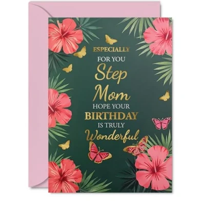 Gold Step Mom Birthday Card Butterflies & Flowers Happy for from Son Daughter, A5 Golden Bday Greeting Cards