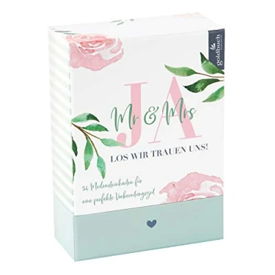 The elegantly designed photo milestone cards from the Lieblingsinge series by Goldbuch invite you to personalise and design your own special moments of the happy bride and groom The card set contains 34 Milestone cards with modern motifs suitable for the time from engagement to wedding and a storage box, which can also be used as a photo stand Record the most beautiful experiences and events until the day of the "yes" word on the diverse memory cards. Photos and pictures and special congratulations can be found on the back On the photo cards the standard photo formats 9 x 13 cm, 10 x 15 cm and 13 x 18 cm can be used. The wedding photo cards are ideal as a gift idea for the couple for an engagement Goldbuch Milestone cards in attractive gift box, motif: Los, wir trauus, contents: 34 pieces, language: German, dimensions: approx. 14 x 19.5 x 6 cm, weight: 400 g, item no. No.: 10 347, EAN: 4009835103470