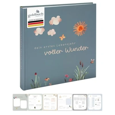 The children's photo album full of wonders from Goldbuch with the motif meadow impresses with many flowers, plants and clouds with a sun on a green background on the high-quality cover The memory album has 62 white pages, 4 of which are illustrated and 58 blank, on which up to 240 photos in 10 x 15 format can be stored. Ideal for all moments and experiences from birth On 4 illustrated pages you can record and immortalise the most important data of your newborn. The paper is suitable for all pens, photo glue, photo taps, photo rollers and photo corners High quality materials and meticulous workmanship; glassine prevents yellowing, swelling or sticking of photos; blank pages are ideal for scrapbooking and collage Goldbuch Baby album, 62 pages: 58 white blank pages and 4 illustrated, glassine dividers, material: linen texture, dimensions: 30 x 31 x 4 cm, weight: 1.04 kg, item no. : 15 512, EAN: 4009835155127