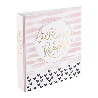 Recipe book made of laminated art print for collecting your favourite recipes, 2-ring mechanism for easy insertion of the pages Includes 25 printed, lined sheets (15.5 x 21 cm), practical division into ingredients and cooking instructions, space for entering the recipe heading Quality: sturdy, laminated art print, hard cover, space for inserting other sheets, spare sheets available Manufacture: made in Germany, sturdy art print, easy to open and close the closure rings, e materials Box contents: 1 Goldbuch recipe book favourite recipes, dimensions: 21 x 22.5 cm, 25 printed sheets, art print, white/gold, 69 042