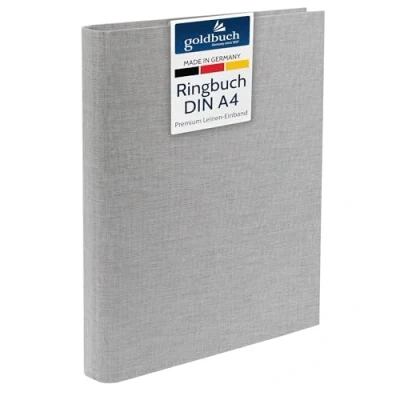 4 ring mechanisms with clamping bracket for additional storage of maps and holiday brochures - ideal for sticking in your most beautiful holiday memories Clear photo sleeves and white and black photo card sheets sold separately A4 size Quality: sturdy, hard cover made of linen, great freedom of design and quick sorting Made in Germany, easy to open and close the locking rings, environmentally friendly materials Box contents: 1 goldbuch Bella Vista photo ring binder (26 x 32 cm), material: linen, colour: light grey, 37 919