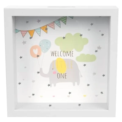 Wish filler Welcome little one from goldbuch combines a practical money box with a decorative picture frame and offers a practical format thanks to its dimensions of 18 x 18 x 5 cm Made from robust MDF in elegant white colouring, the money box impresses with its durable stability and timeless look, which can be perfectly integrated into different living styles Thanks to the interchangeable background, you can make your money box creative while adding an inspiring touch to the elephant motif Environmentally friendly materials and careful workmanship reflect the quality standards and ensure long-lasting joy with the money box - quality made in Germany goldbuch 92 0082 wish filler for standing and hanging, design: Welcome little one, colour: white, dimensions: 18 x 18 x 5 cm, material: MDF, item no. : 92 0082, EAN: 4045352920824