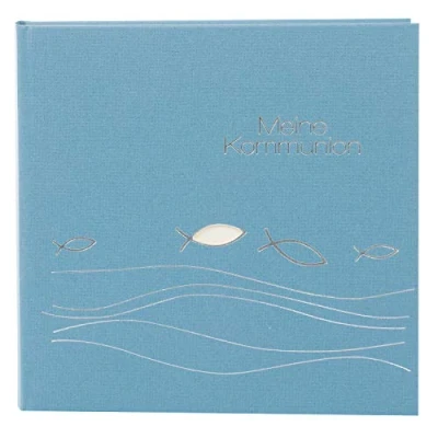 PHOTO book, Holy Communion Dress Ichthys fish Blue Natural Roll Silver Embossed 25 x 25 cm 60 Pages 4 illustrated pages