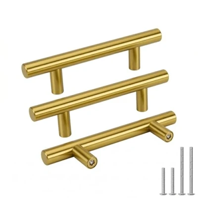 goldenwarm 25pcs Brushed Brass Kitchen Cabinet Hardware Handle 12mm Diameter T Bar Handles Furniture Gold Door Drawer Pulls Knobs Hole Spacing 76mm 3in
