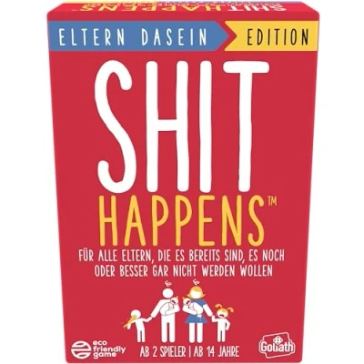 Happens is back with a new edition: this time even more people can join because the card game is playable from 14 years INVOICE TO ALL PARENTS This edition is specifically designed for (expecting) parents, with many known situations that every parent knows Collect 10 cards to win: Place the Happens cards on your road of pain. If you guess correctly, you can keep the cards. When you are the first to collect 10 cards, you won MORE GAMES IN THE HAPPENS RANGE: Happens Parents Edition isn't the only fun game from Happens. Check out our original Happens, real and 50 shades of if you are interested. MANY KNOWN SITUATIONS Some examples of familiar situations that unfortunately every parent knows and that players should rank on the degree of evil are: what is there to eat tonight?, separation anxiety and mud marks in the house, Manufacturer: Goliath