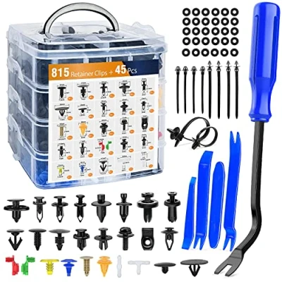 Universal Fit Kit:The kit contains 26 types of most common sizes of fastener clips, suitable for the OEM replacement in 5-11mm hole sizes,that you’ll always have the right size Top Quality:These car retainer clips are made of high-quality black nylon material, anti-wear and anti-corrosion, would not break or crack easily during use Perfect For What You Need:Up to 815 pieces of retainer clips in a plastic box, allows to freely DIY your vehicle accessories at anytime you wanted. It is definitely cheaper than going to the auto parts store Varies Accesories:We provide different size fastener removers,sponge-cushion and cable ties to help you quickly and easily remove car door panel and upholstery clips without causing damage to them. Easy access into confined areas always covers some applications include telecom equipment, motor vehicles, domestic appliances, furniture and electrical equipment Wide Application:Professional push clips are widely used for car panel, door trim, bumper and fender for GM Ford Toyota Honda Chrysler etc. 20Pcs Front Bumper Push-Type Retainer With Internal Metal Insert, 20Pcs Bumper & Splash Shield Push-Type Retainer With Metal Insert and 1PC Fastener Remover damage to them