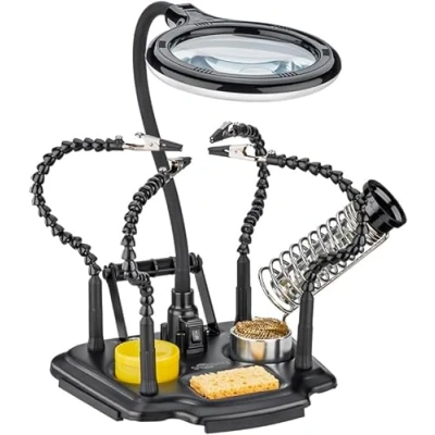 Soldering aid with magnifying lamp: facilitates delicate soldering work. The soldering aid with 1.75x magnifying glass and 40 LEDs provides optimal illumination. Perfect for board holders and precise tasks. FLEXIBLE GOOSENECK DESIGN Four gooseneck arms with alligator clips provide flexibility and secure hold for workpieces. Ideal for board holders and DIY projects. Safe and gentle: insulated alligator clips protect workpieces from damage. This soldering aid is essential when precision and safety are required when soldering is required. Built-in Soldering Accessories: the board holder has solder holder, soldering iron stand, cleaning wool, flux and soldering sponge. This supplement makes precise soldering more efficient and organized. Stable stand and thoughtful design: the soldering aid stands securely on any work table thanks to non-slip rubber feet. High-quality materials and a well thought-out construction guarantee comfortable work without slipping - even with the finest soldering work., Weight: 2.9101018584 pounds, Manufacturer: Wentronic