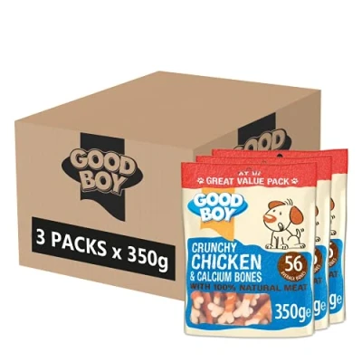 STOCK UP ON DOGGY FAVS: never be without your pup's favourite treat, with our bulk box - contains 3 packs of 350g Good Boy Chicken & Calcium Bone Dog Treats NATURALLY MEATY: made with 100% natural chicken breast meat, for that meaty treaty taste LOW FAT TREAT: a healthier snack with only 1% fat makes the perfect guilt free treat for your four-legged friend TREATS FOR TRAINING: these little bites are ideal for letting your pooch know they are a good dog!